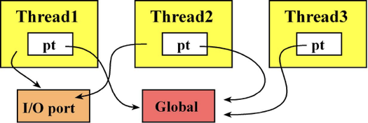 공유점: 하지만 전역 변수(Global Memory)와 I/O 장치(UART, GPIO 등)는 모든 스레드가 공유합니다.