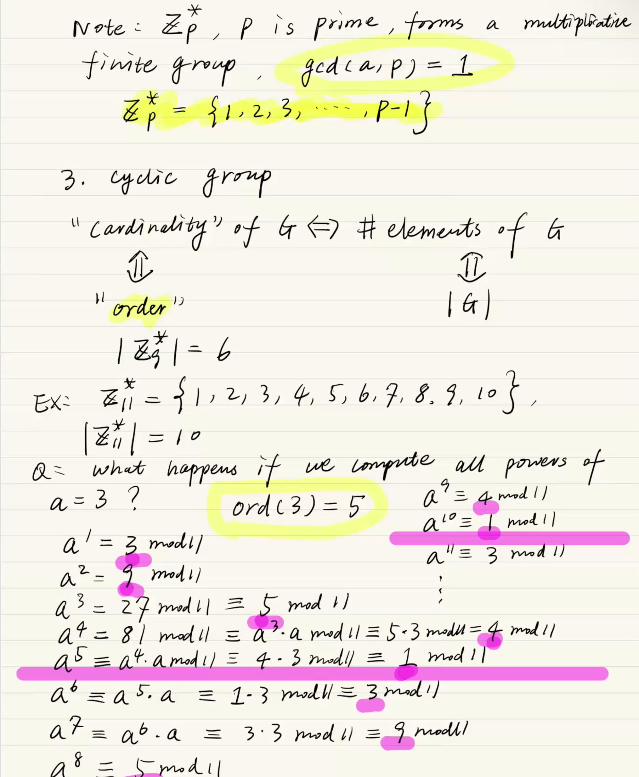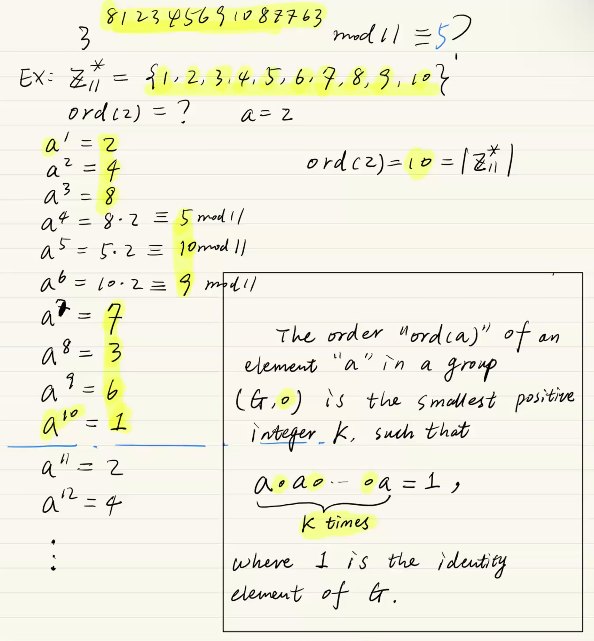 필기의 표는 집합 내의 모든 원소 a (1부터 10)에 대해, 거듭제곱해서 1이 나오기까지 걸리는 최소 횟수인 ord(a)를 전부 계산해 놓은 것입니다.