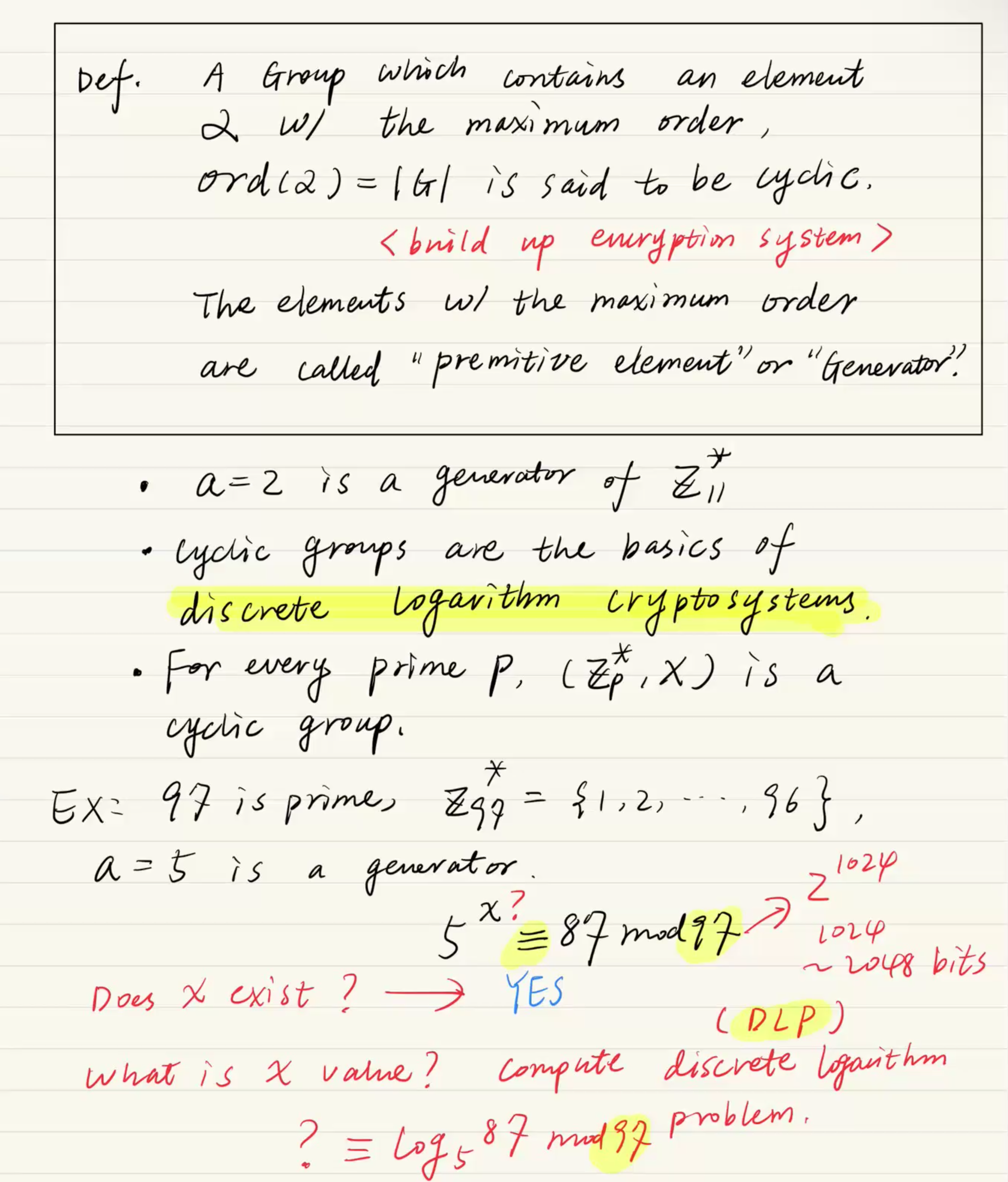 이러한 순환군의 특성은 디피-헬먼 같은 '이산 대수 암호 시스템(Discrete logarithm cryptosystems)'을 구축하는 가장 중요한 수학적 기초가 됩니다.교수님은 "모든 소수 P에 대한 곱셈 유한군 Zp∗ 는 항상 순환군이다"라는 법칙을 강조하셨습니다.