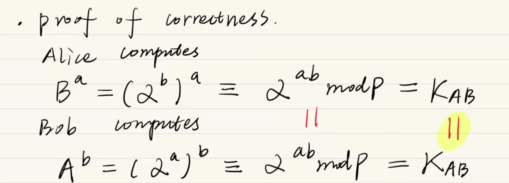 - 대입해서 식을 풀어쓰면 (αb)a가 되고, 지수의 곱셈 법칙에 의해 최종적으로 αab(modP) 가 됩니다.