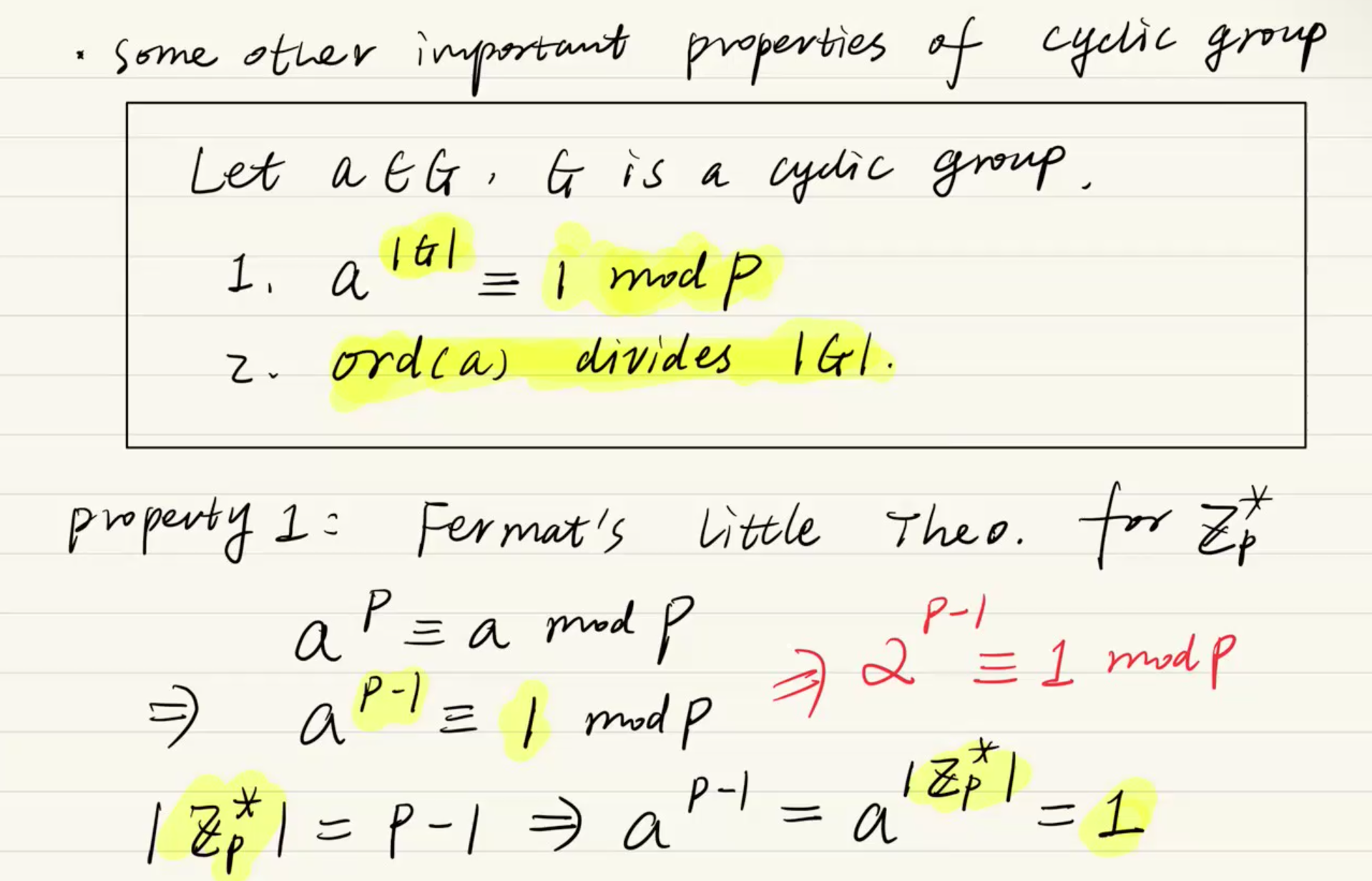 필기 하단은 교수님이 앞서 배웠던 페르마의 소정리(Fermat's Little Theorem)를 가져와 첫 번째 성질이 진짜로 맞는지 증명하는 과정입니다.