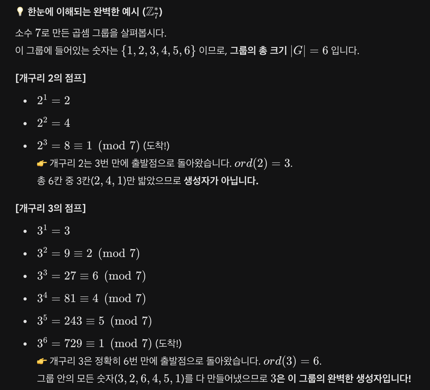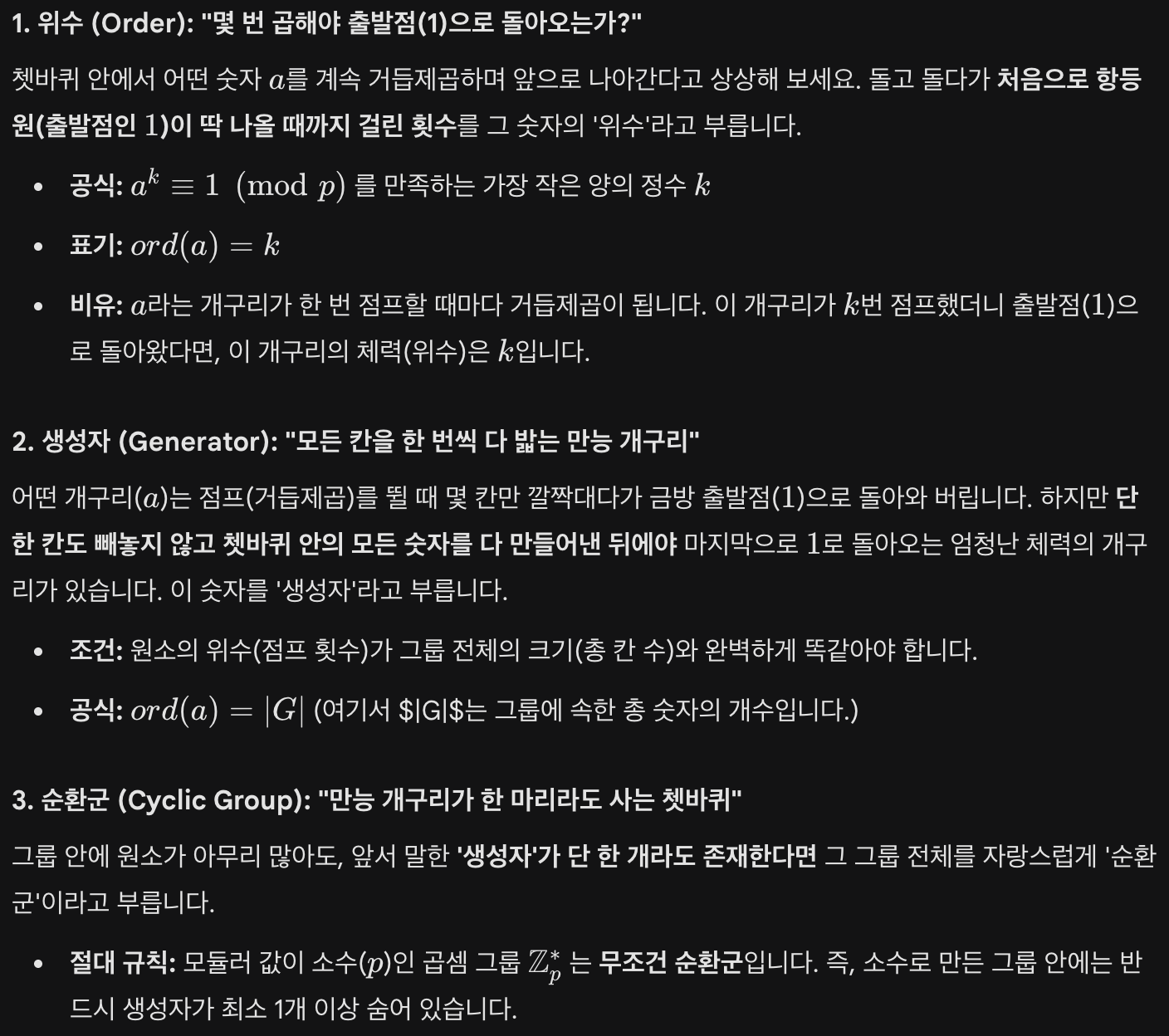 원소의 위수 (Order of an element): 어떤 원소 a를 계속해서 거듭제곱했을 때, 처음으로 항등원(1)이 나오게 하는 가장 작은 지수 K를 뜻합니다. (aK=1 일 때, ord(a)=K)