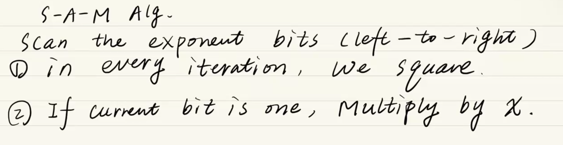 이 알고리즘은 지수(Exponent)를 이진수(Binary)로 변환한 뒤, 비트의 패턴(0과 1)에 따라 '제곱(Square)'과 '곱셈(Multiply)' 단 두 가지 연산만 조합하여 계산량을 획기적으로 줄여줍니다.