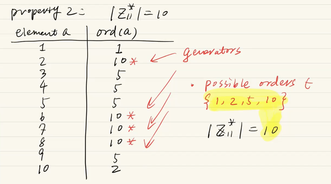 소수 11을 모듈러로 하는 집합 Z11∗ 안에는 1부터 10까지의 숫자가 들어있습니다.따라서 이 그룹의 전체 크기(∣Z11∗∣)는 10이 됩니다.