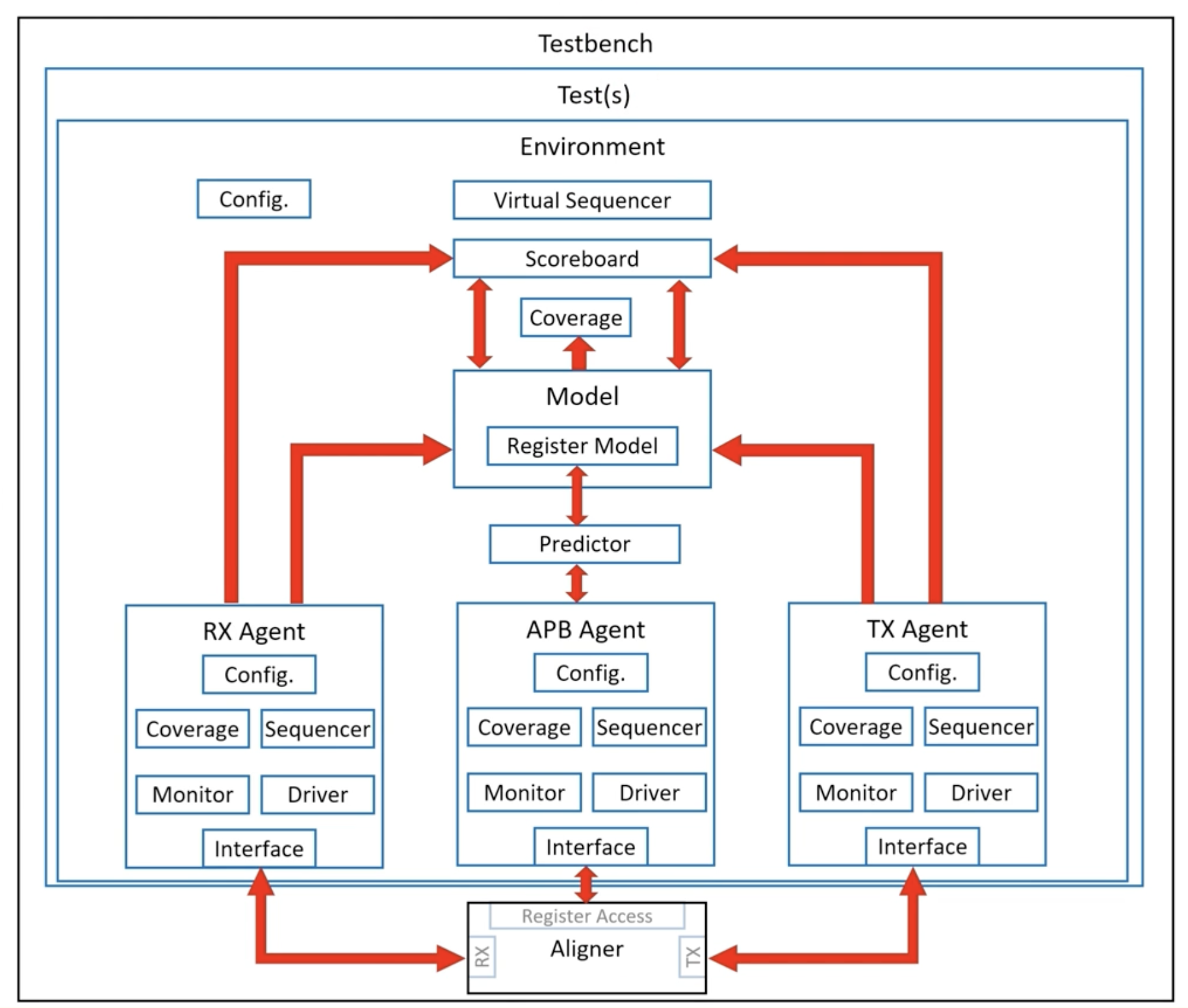 Virtual Sequencer (가상 시퀀서): 여러 Agent들(APB, RX, TX)을 지휘자처럼 한 번에 통제하고 순서를 맞출 수 있게 해주는 최상위 컨트롤러입니다.