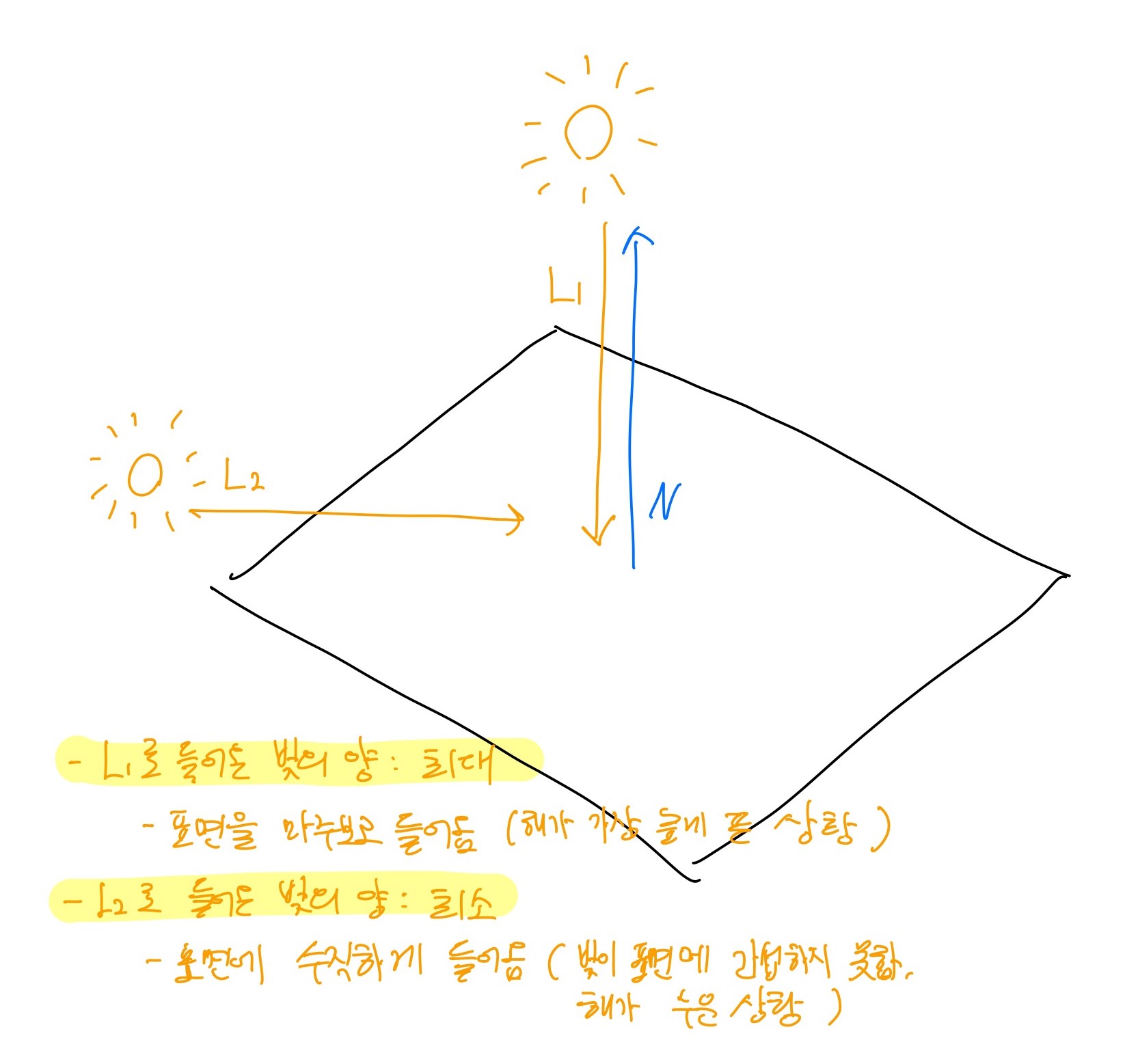 - 카메라의 시선벡터 (부호반대)와 내적해서 유사도 계산
