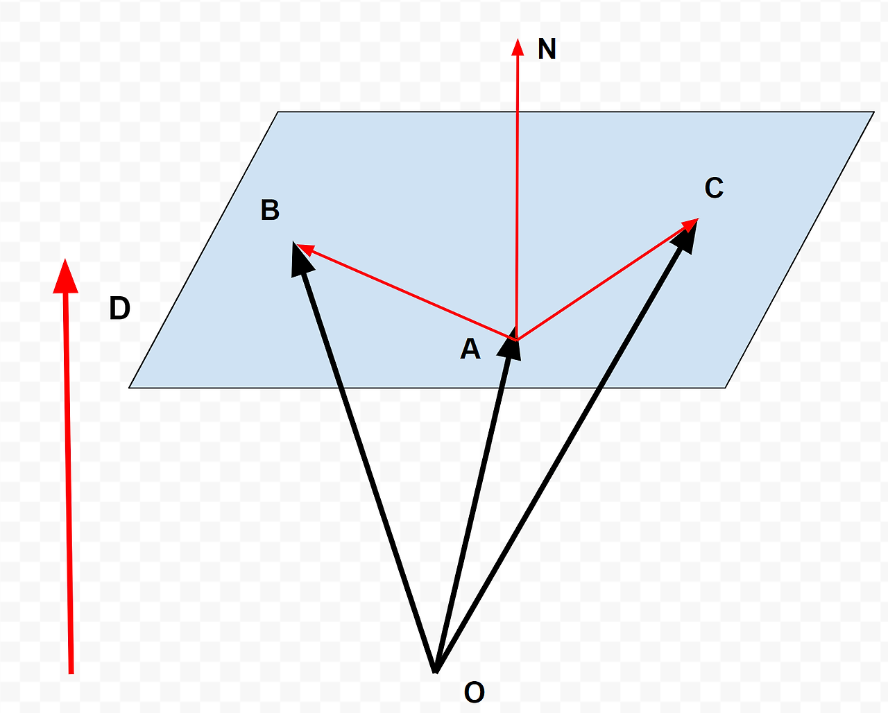 - 즉 평면의 방향벡터와 노말벡터의 내적값은 항상 0으로 같음