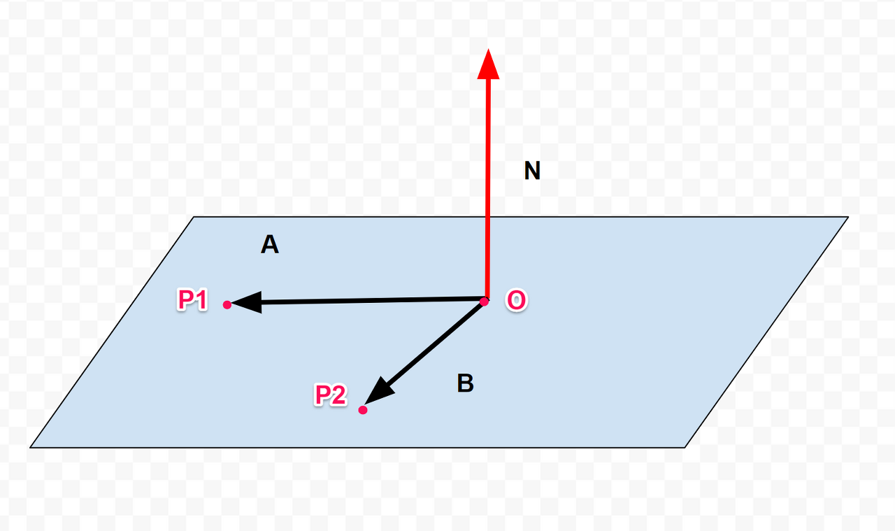 - 평면 위의 아무 점들 간 방향벡터와 평면의 노말벡터는 수직임
