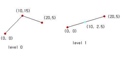 : level0 (0, 0), (10, 15), (20, 5)과 level1(0, 0), (20, 5)으로 구성된 직선이 있을 때