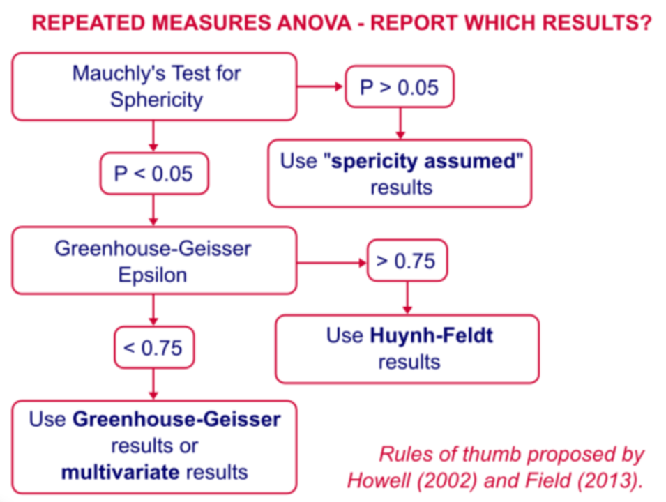 Epsilon 보정은 RM Anova가 구형성을 만족하지 못했을 때, 자유도를 보정해줍니다. epsilon의 종류는 크게 Greenhouse-Geisser (G-G)의 epsilon과 Huyhn-Feldt (H-F)의 epsilon이 있습니다. Epsilon의 값은 1보다 작거나 같은 값으로 표현됩니다. 만약 데이터가 구형성을 만족하지 못한다면 자유도를 떨어뜨리는 방식으로 보정이 진행되어야 합니다.