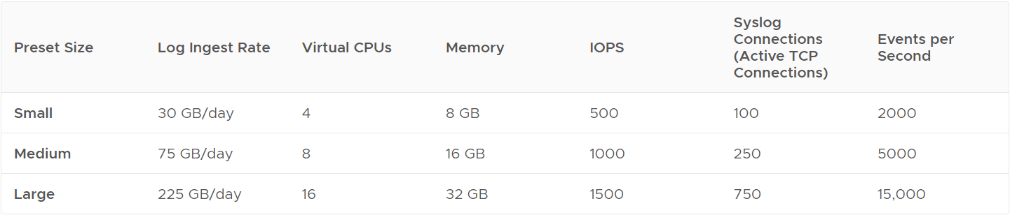 VMware Aria Operations for Logs는 환경의 수집 요구 사항을 충족하기 위해 선택할 수 있는 사전 설정된 VM(가상 머신) 크기를 제공합니다. 이러한 사전 설정은 컴퓨팅 및 디스크 리소스의 인증된 크기 조합이지만 나중에 추가 리소스를 추가할 수 있습니다. 작은 구성은 데모에만 적합합니다.