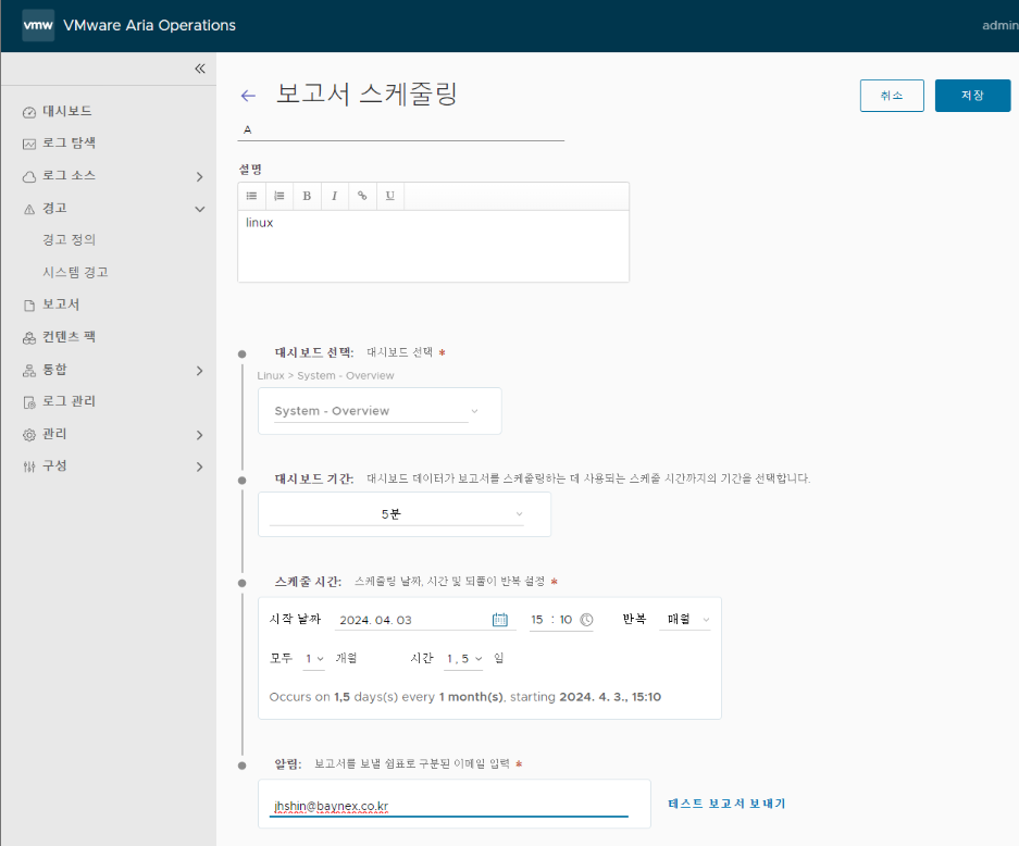 7. 알림에서 보고서에 대한 이메일 알림을 보낼 수신자 이메일 주소를 쉼표로 구분해서 입력합니다.