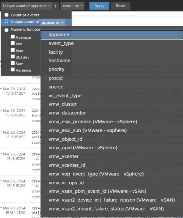 VMware Aria Operations for Logs는 이벤트 그룹화 외에 그룹의 각 이벤트에서 스마트 필드라고 하는 유용한 필드를 식별합니다. 각 스마트 필드는 담당자 이벤트 내에서 하이퍼링크로 표시되며 옆에는 드롭다운 메뉴 아이콘이 있습니다. 아이콘을 클릭하여 필드 값에 대한 히스토그램을 보거나 스마트 필드를 기준으로 추출된 필드를 정의할 수 있습니다.