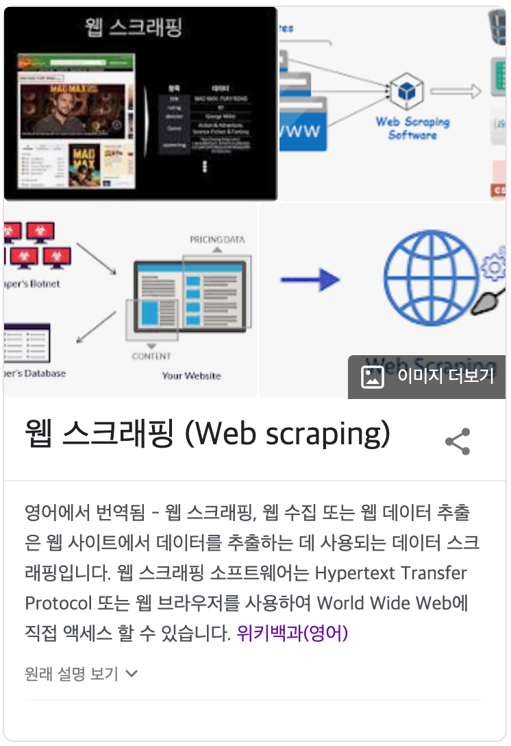 구글에 Web scraping(또는 웹 스크래핑)이라고 검색하면 오른쪽에 나오는 창이다. 이것이 웹 스크래핑이다.
