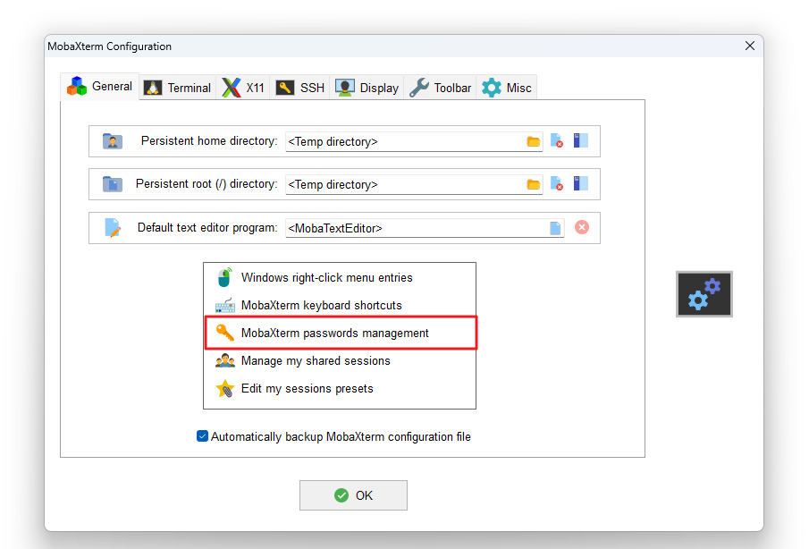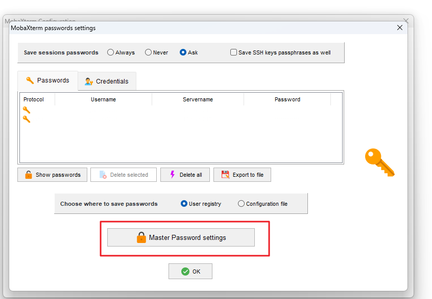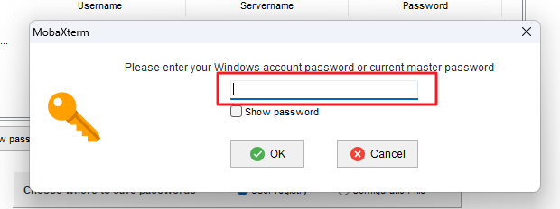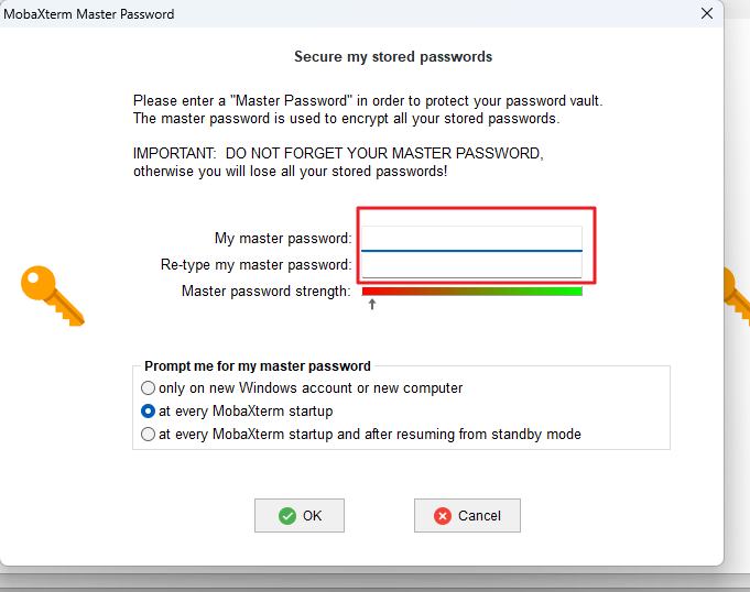*하단에 prompt me for my master password는 취향껏.. 개인적으로 MobaXterm 시작할 때 마다 비번 입력하길 원해서 startup으로 함