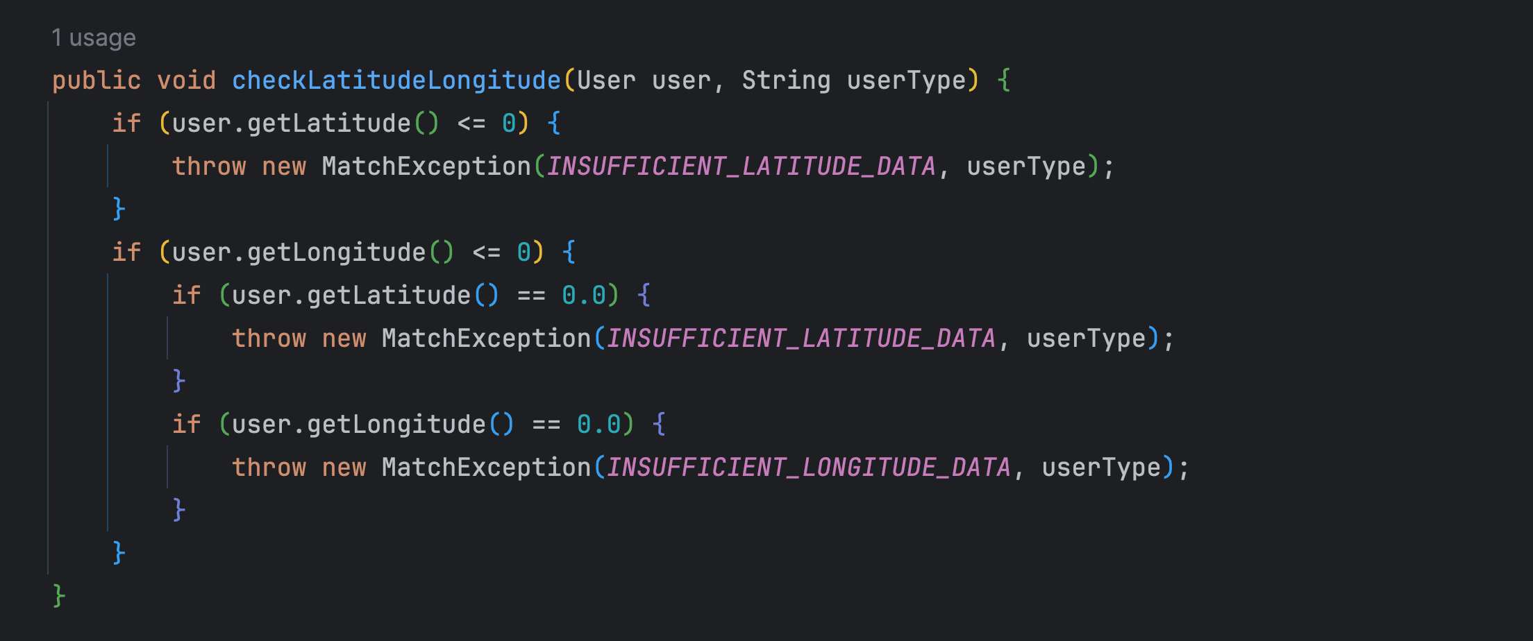 double distance = matchPlaceService.calculateDistanceOnly(user, targetUser);