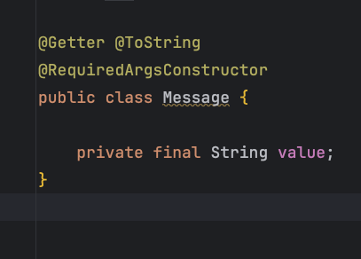 Message 클래스는 단일 문자열 메시지를 나타내는 용도로 사용되며, 단순한 문자열 데이터를 캡슐화하는 역할을 한다. -> ? 이거 쓰나?