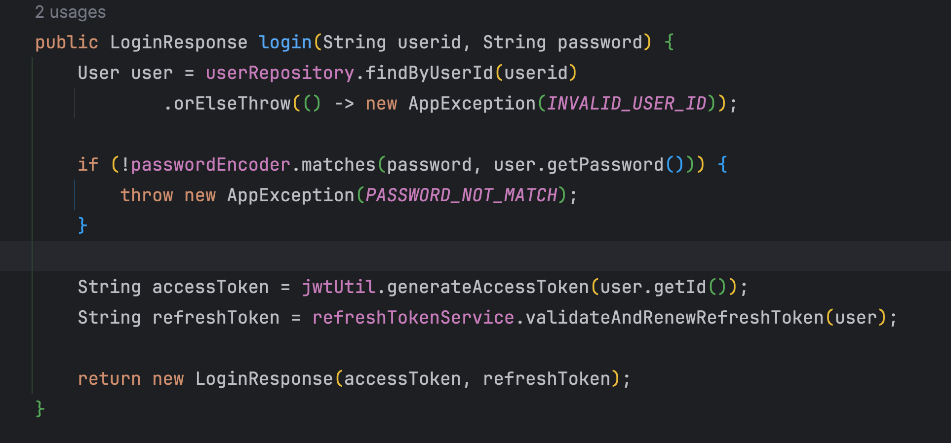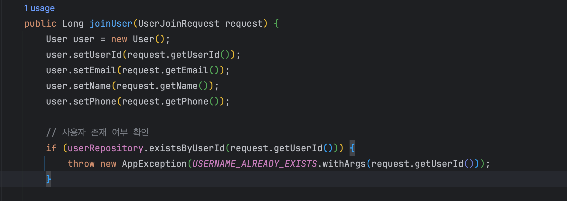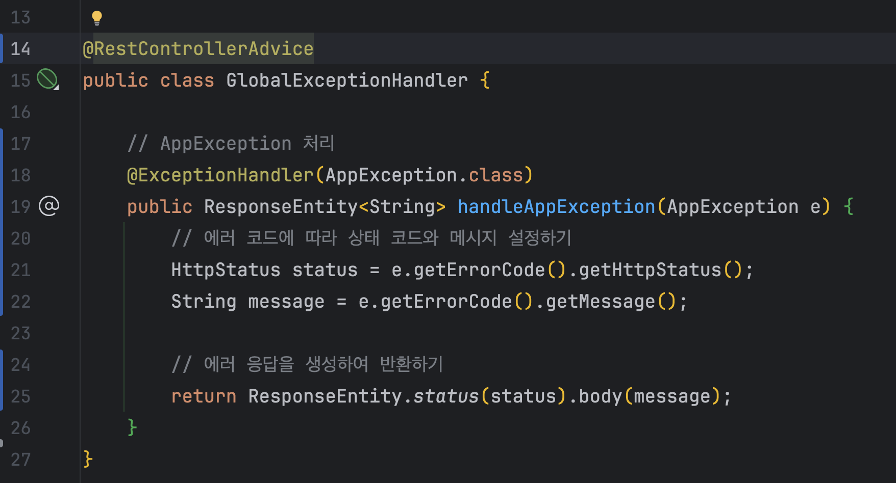 AppException은 특정 비즈니스 로직에서 예외 상황이 발생했을 때 예외를 정의하고 발생시키기 위해 사용됨.USER_NOT_AUTHORIZED라는 ErrorCode를 포함한 AppException을 발생시킬 수 있다.AppException은 서비스나 도메인 로직에서 발생시킨다!.GlobalExceptionHandler : GlobalExceptionHandler는 서비스나 다른 부분에서 발생한 예외를 잡아서 처리하는 클래스.AppException이 발생하면 GlobalExceptionHandler가 이 예외를 잡아서 클라이언트에 적절한 응답을 돌려주게 된다!@ExceptionHandler 메서드들이 처리하게 되는 것!.