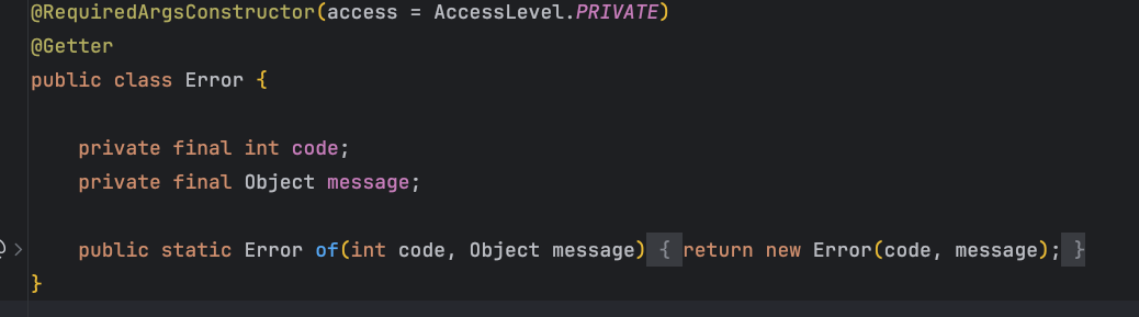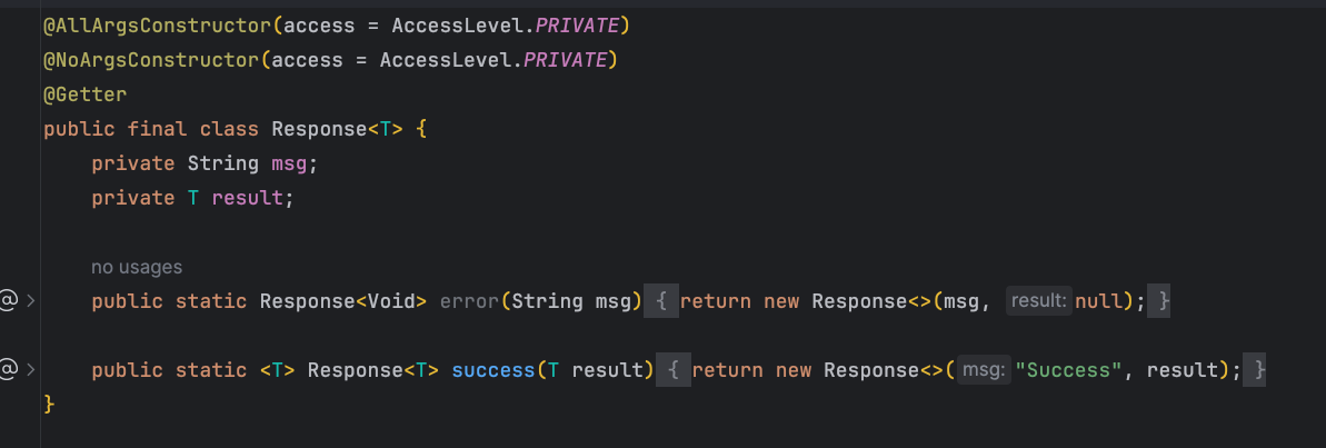 @RequiredArgsConstructor(access = AccessLevel.PRIVATE): 모든 final 필드를 초기화하는 생성자를 자동으로 생성하지만 PRIVATE 접근 수준을 부여하여, 외부에서 직접 인스턴스를 만들지 못하게 제한하도록 설정