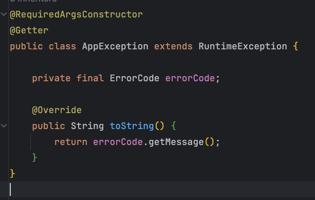 AppException 클래스는 애플리케이션에서 발생하는 예외를 처리하기 위한 커스텀 예외 클래스.