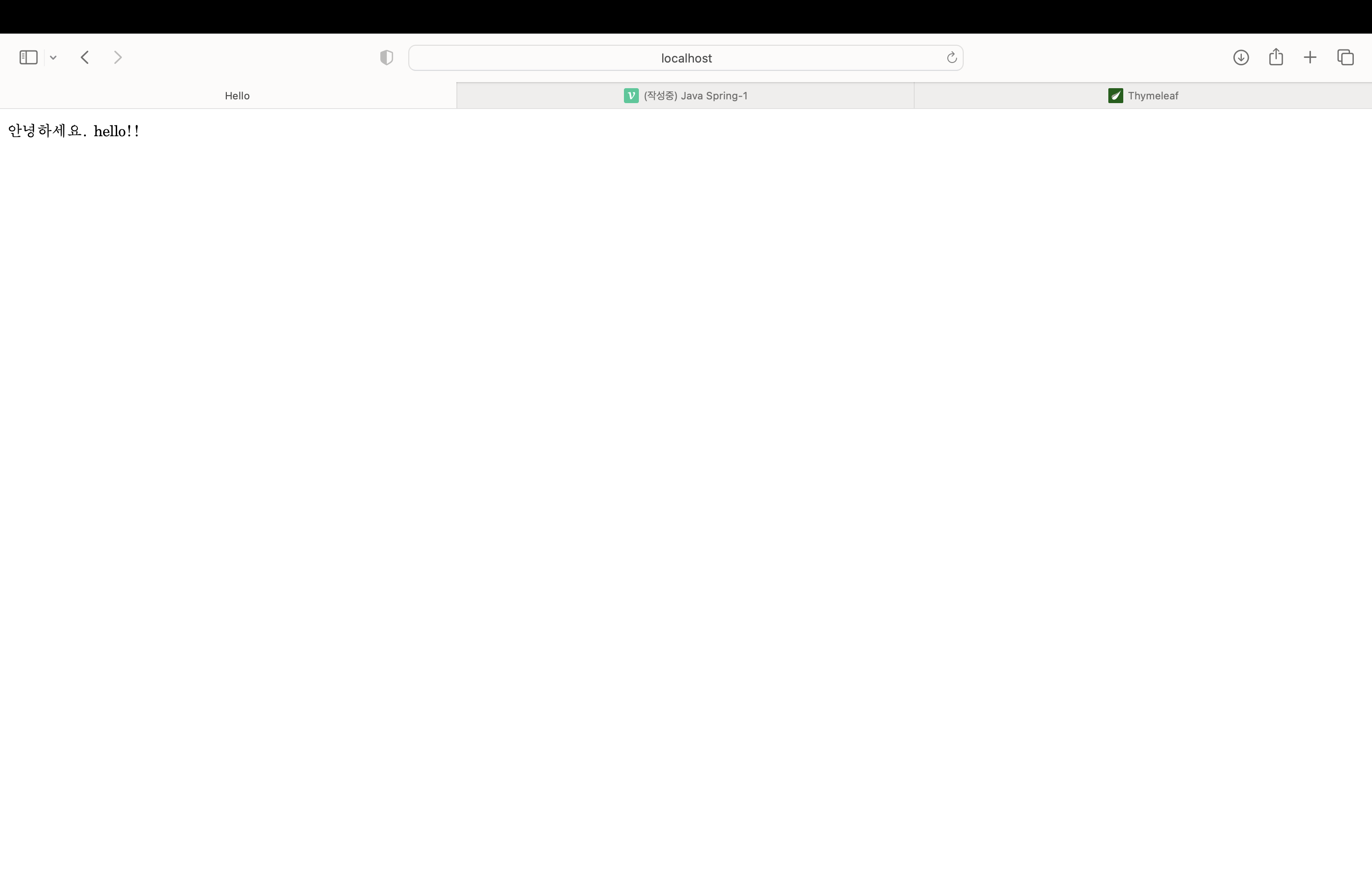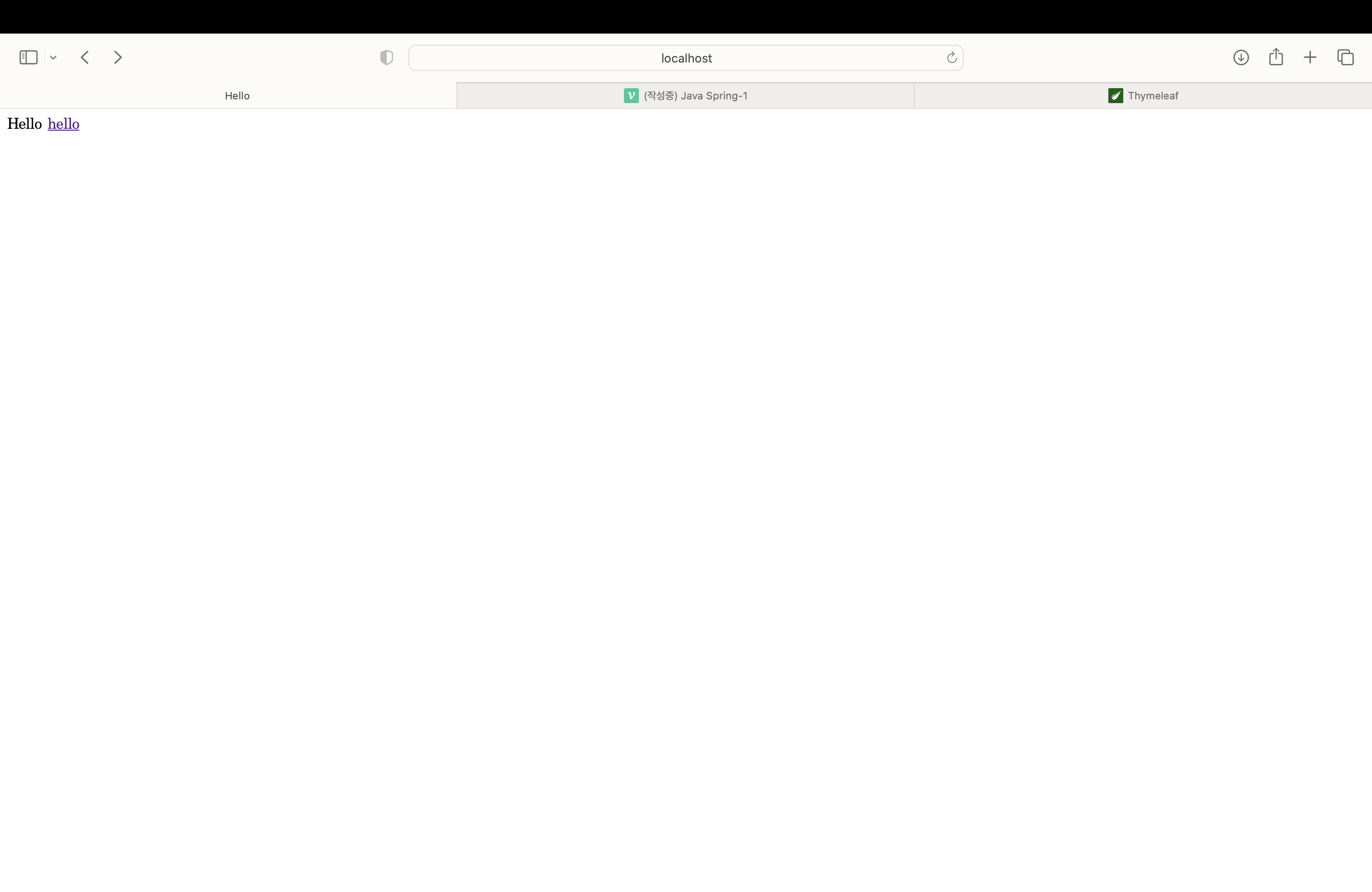 - hello 버튼을 클릭하거나 localhost:8080/hello 주소로 이동하면 다음 사진과 같은 페이지로 이동한다.