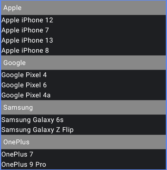 val phones = listOf("Apple iPhone 12", "Google Pixel 4", "Samsung Galaxy 6s",