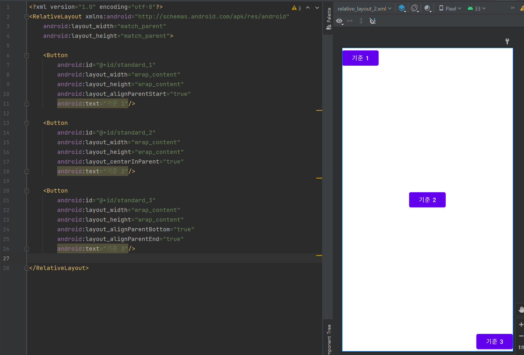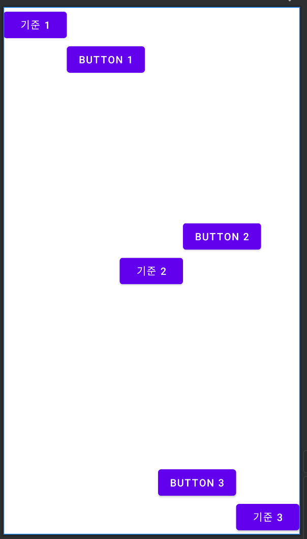 이제 앞서 만든 자식 뷰 중 하나를 기준으로 새로운 위치를 지정한다. 기준1 버튼의 오른쪽 아래에 BUTTON1을 위치시키는 코드를 작성한다. 기준2 버튼 오른쪽 위에 BUTTON2를 위치시킨다. 기준3 버튼 왼쪽 위에 BUTTON3을 위치시킨다.