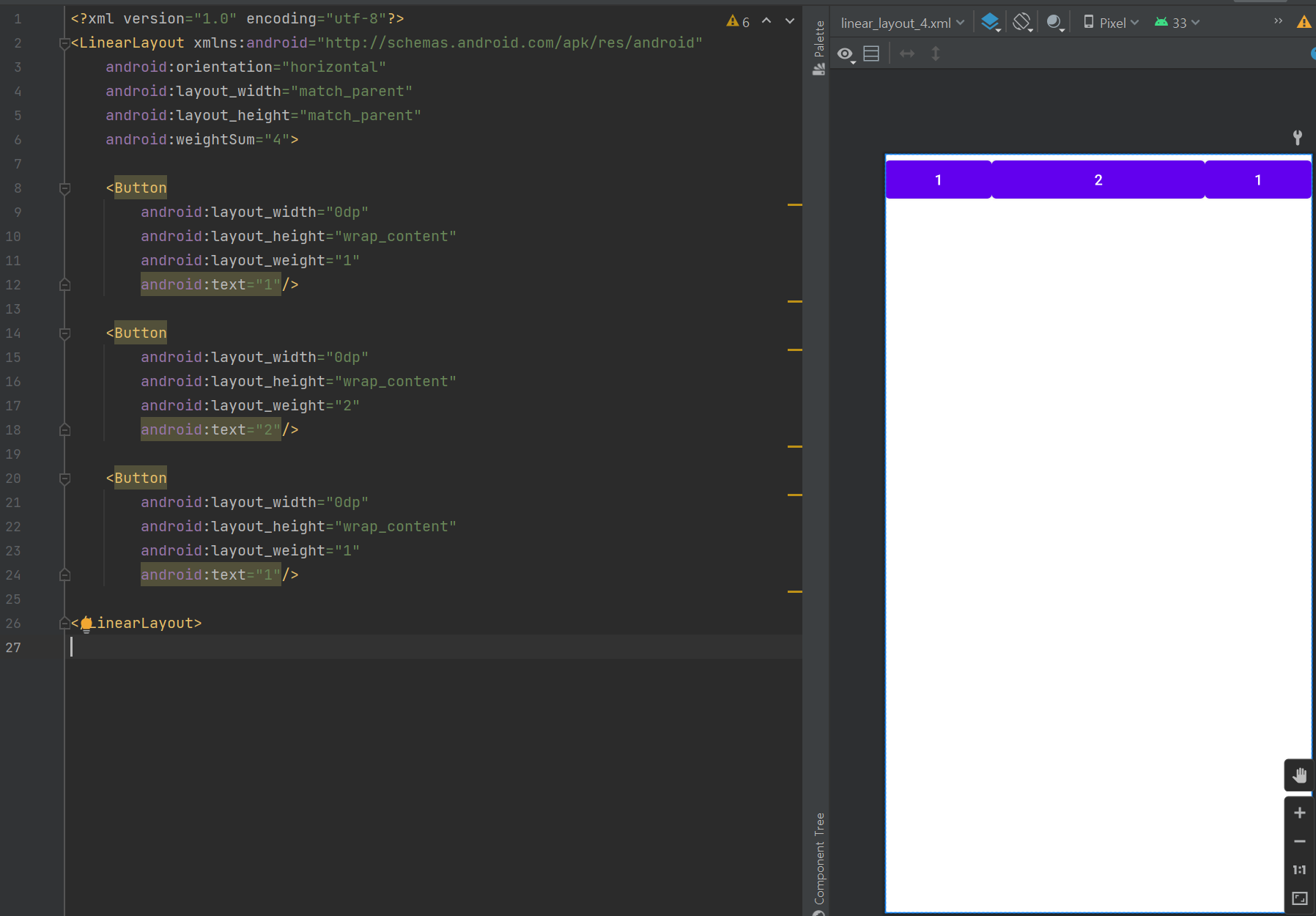 각 버튼의 속성에 더 이상 가로 크기를 명시적으로 지정해주지 않으니 0dp라고 해준다. 레이아웃에서 뷰가 정해진 고정 값이 아닌 경우에는 0dp를 넣어준다. 그리고 layout_weight를 비율에 맞게 지정해주어야 한다.