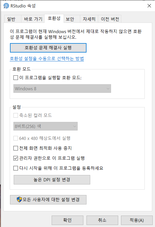 - 실행하기 전에 R Studio를 관리자 권한으로 실행시키기 위해 속성 - 호환성 탭에 들어가 관리자 권한으로 이 프로그램 실행 클릭 후 확인을 눌러 실행해야 한다.(권리자 권한으로 실행시키지 않으면 나중에 오류가 발생한다고 한다.)