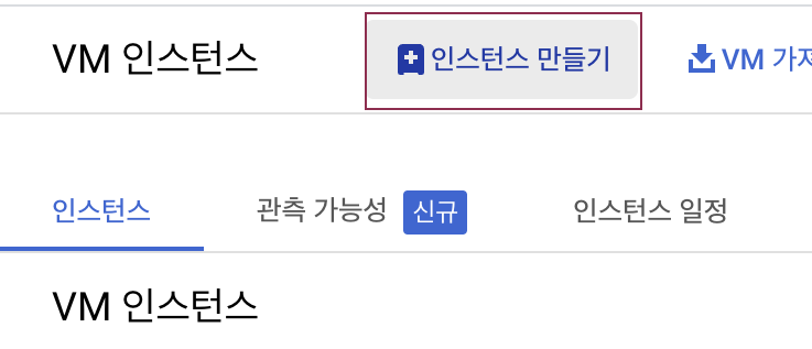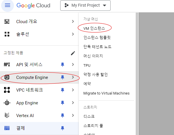 왼쪽 메뉴바에 보면 Compute Engine 이라는 메뉴가 있고, 그 안에 vm 인스턴스라는 메뉴를 찾을 수 있습니다.
