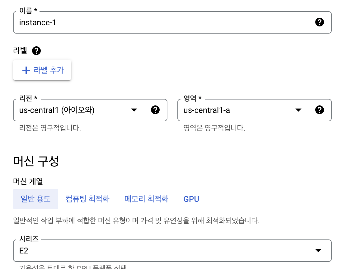 이름, 리전(지역), 영역, 머신계열 등을 선택하여 vm 인스턴스를 설정합니다.