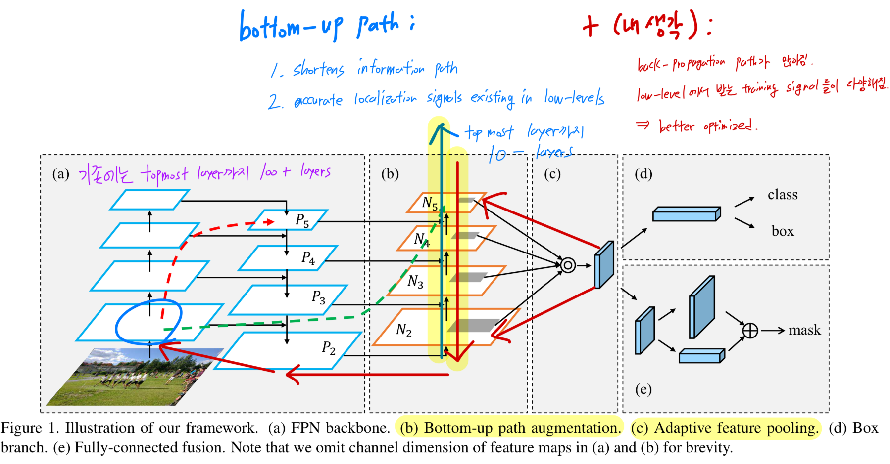 구체적으로, bottom-up path augmentation을 통해 lower layeers의 accurate localization signals로 the entire feature hierarchy를 강화하고,