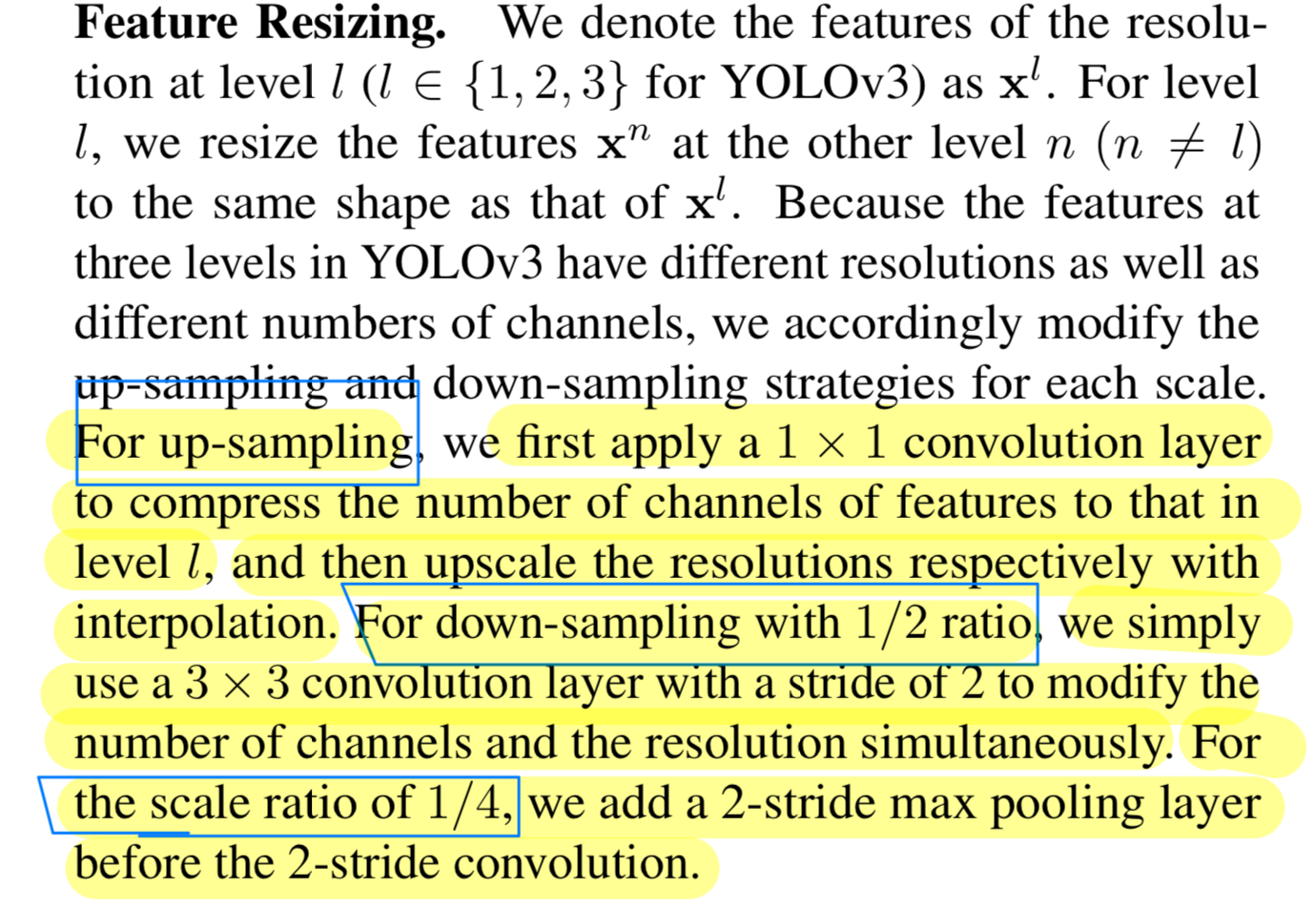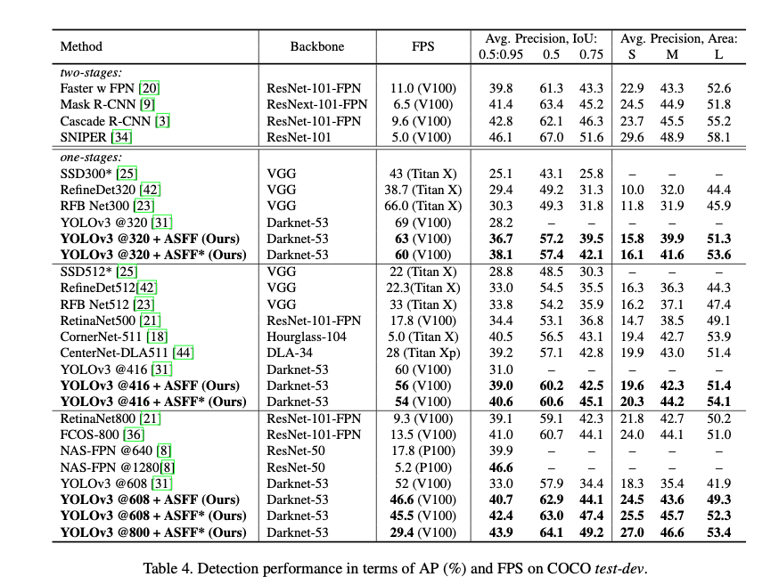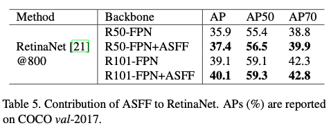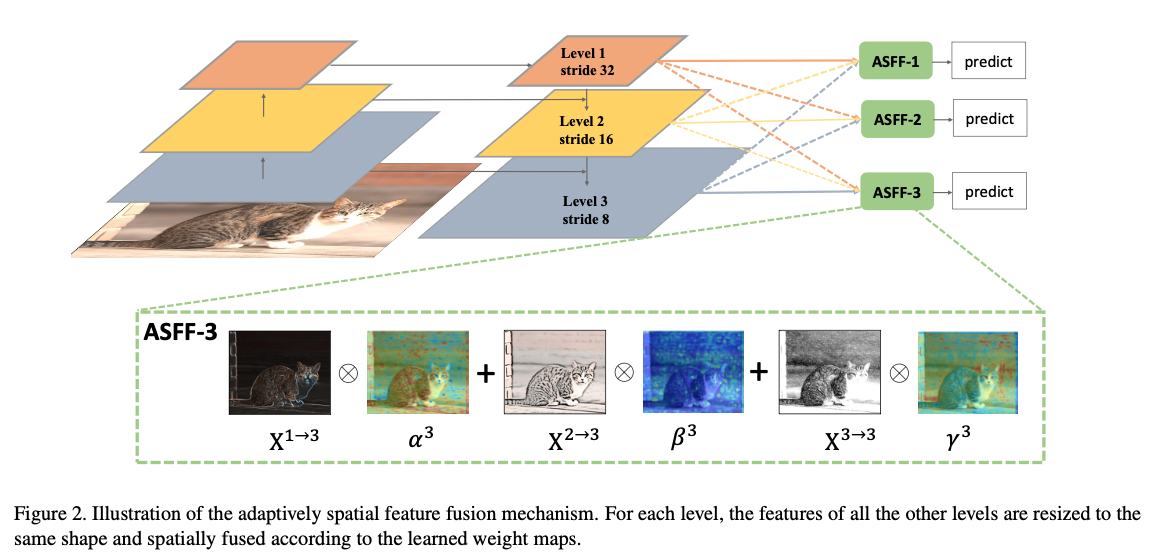 - ASFF는 다른 levels에서의 features에서 spatially filtering하는 방법을 학습하여, useful information만 유지하여 combination 한다.