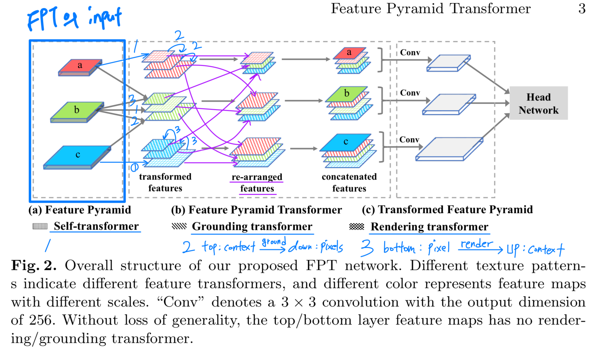 FPT는 any feature pyramid를 same size를 갖지만 richer contexts를 갖는 another feature pyramid로 transform된다.