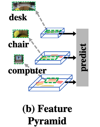Fig. 1 (b)에서 보듯이, 우리는 서로 다른 level의 feature map을 활용하여 다양한 크기의 objects를 인식할 수 있다.