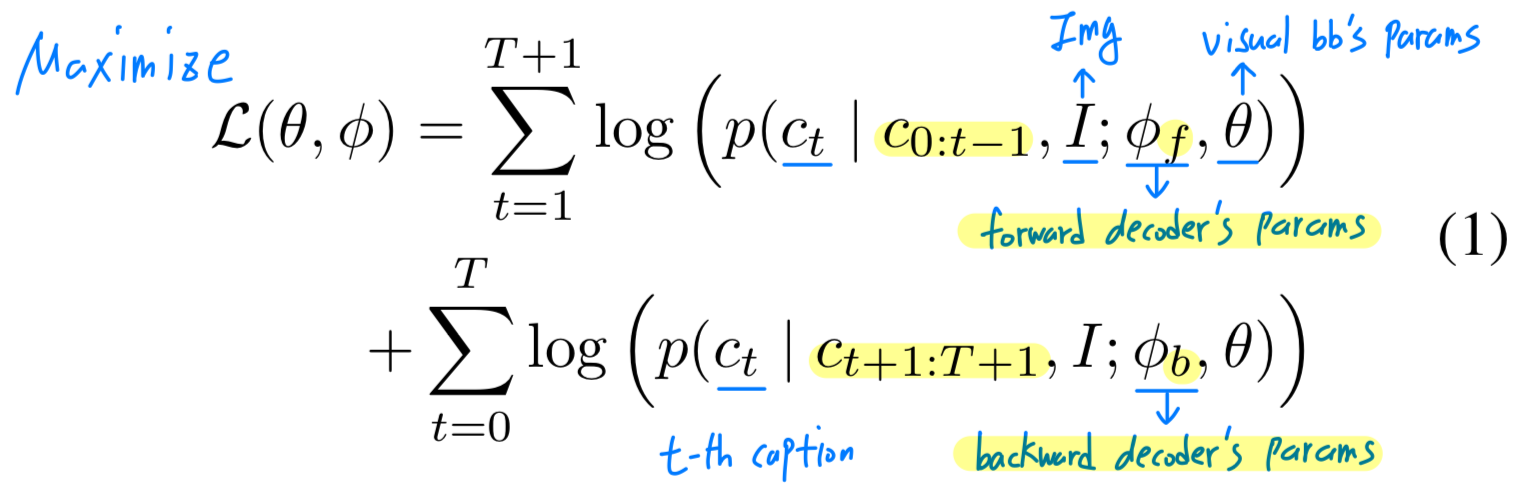 backwrad captioning은 R2L 방향으로 caption 생성. 즉, "[EOS] table the on sits cat A [SOS]"
