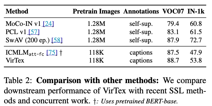 Table 2: VirTex와 최신 Self-Supervised Learning(SSL) 방법들(MoCo, SwAV 등) 및 concurent 연구(ICMLM)의 성능을 비교