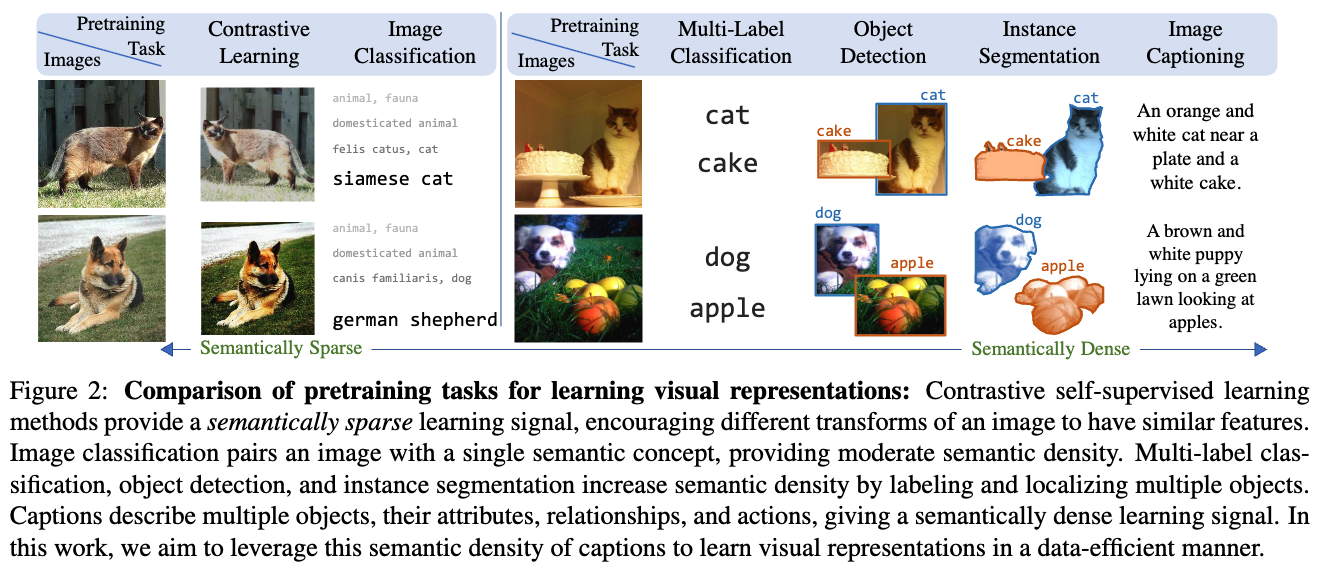 caption들은 unsupervised contrastive methods와 supervised classifiction보다 a semantically denser learning signal을 제공한다.