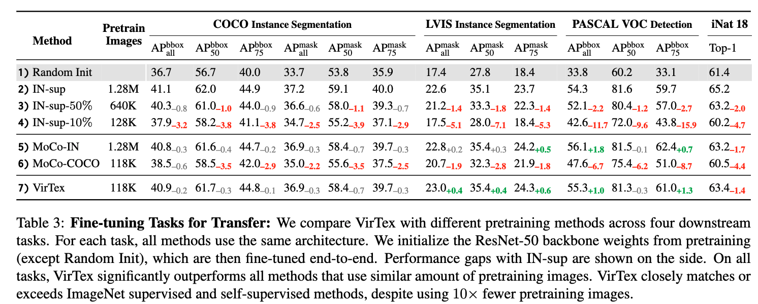 모든 tasks에서 VirTex는 ImageNet에서의 기존 supervised or unsupervised pretraining 방법들과 비교해 최대 10× 적은 images로도 동등하거나 더 나은 성능을 달성한다.