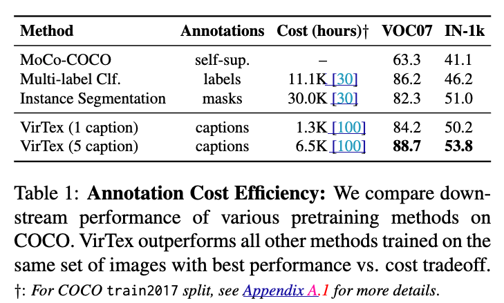 동일한 image(COCO)를 사용하더라도, caption을 사용하여 학습한 VirTex가 다른 anootation 형태(multi-labels classification, instance segmentation mask)를 사용한 model들보다 적은 비용으로 더 높은 성능을 달성한다는 것.