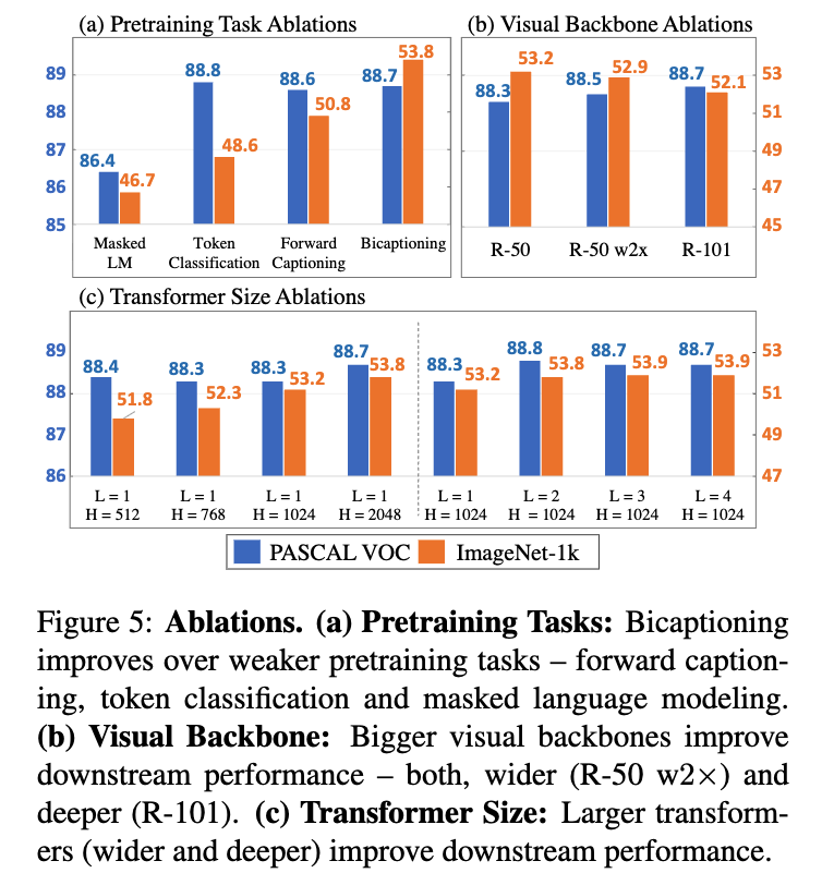 (a) pretrainint task: Bicaptioning이 MLM, Token Classification, forward captioning(단방향)보다 visual representation learning에 뛰어남.