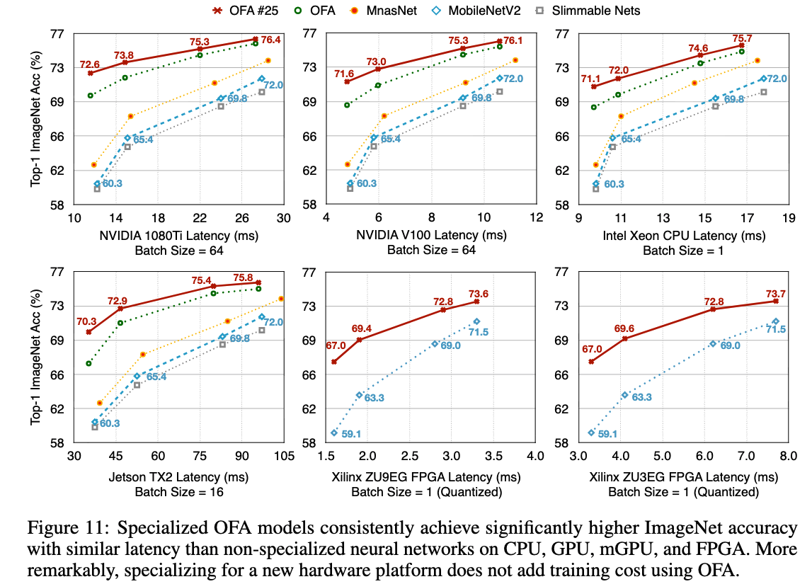 OFA는 retraining 없이 depths, widths, kernel sizes, and resolutions을 flexibly supports한다.