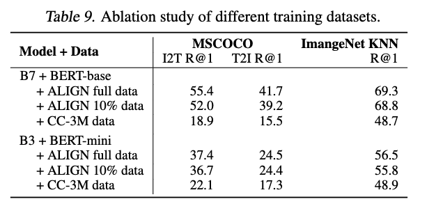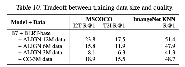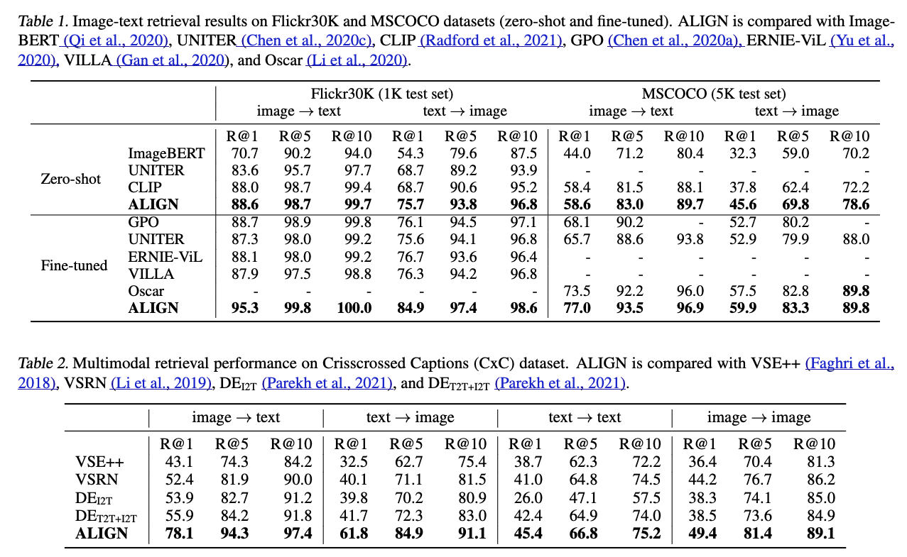 예를 들어, ALIGN은 Flickr30K와 MSCOCO에서 대부분의 zero-shot 및 fine-tuned R@1 metric에서 이전 SOTA method 보다 7% 이상 outperform한다.