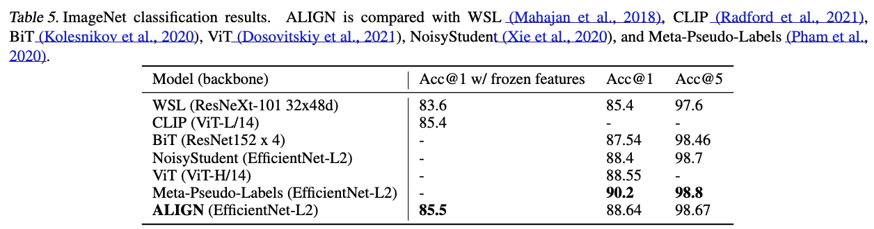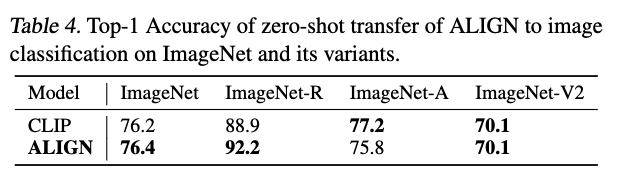예를 들어, ALIGN은 ImageNet에서 88.64% top-1 accuracy를 달성한다.