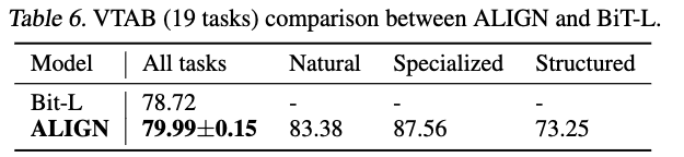 또한, Kolesnikov et al. (2020)을 따라 ALIGN model의 robustness를 Visual Task Adaptation Benchmark(VTAB) (Zhai et al., 2019)에서 평가한다.