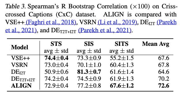 또한 MSCOCO를 확장한 Crisscrossed Captions(CxC) (Parekh et al., 2021) 에서도 ALIGN을 평가한다.