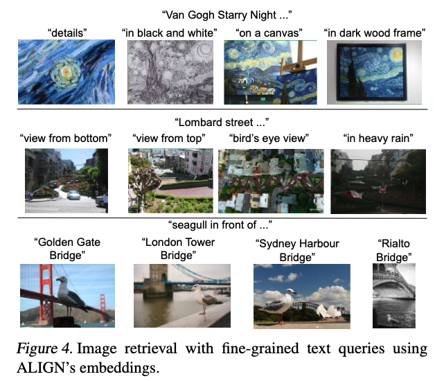 Figure 1-bottom(내가 3이라고 표시해놓은 부분)은 ALIGN으로 구축된 실제 retrieval system에서 나온 cross-modal retrieval examples를 보여준다.