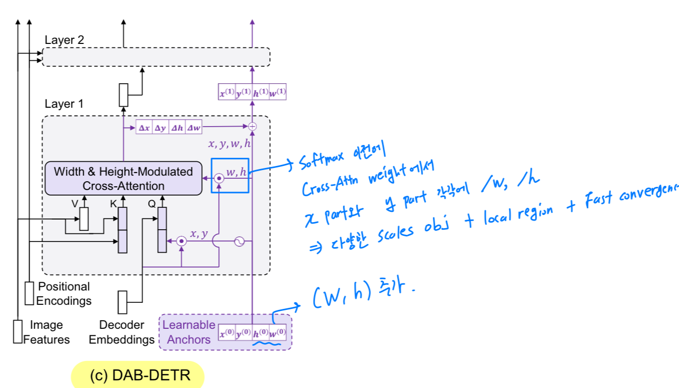anchor box size (w,h)를 활용해 cross-attention map을 modulate함으로써 anchor box size를 adapting할 수 있다.