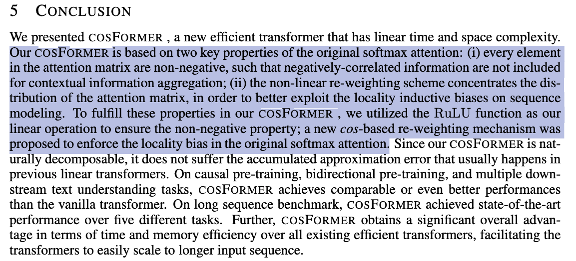 본 논문에서는 COSFORMER라는 Linear Transformer를 제안한다.