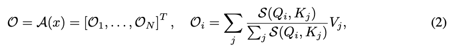 vanilla transformer architecture에서는 일 때, softmax operation이 적용되어 attention matrix 에 대해 row-wise normalization이 수행된다. (Eq. 2)